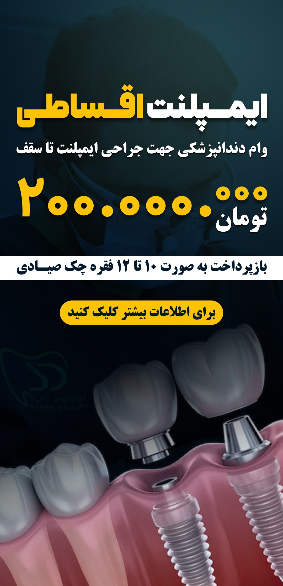 ما در تلاشیم تا در مجموعه خود در دندانپزشکی دکتر سعید داج لیری با استفاده از به روزترین امکانات و تکنولوژی های حوزه دندانپزشکی، خدمات تخصصی را در فضایی آرام و مناسب به شما مراجعه کنندگان عزیز ارائه دهیم. در مجموعه دندانپزشکی دکتر سعید داج لیری میتوانید ایمپلنت در رشت و جراحی ایمپلنت در فومن را با شرایط ویژه انجام دهید. کلیه خدمات تخصصی ایمپلنت اقساطی در رشت و فومن توسط دکتر داج لیری انجام میشود.جهت دریافت نوبت و هماهنگی و مشاوره میتوانید از طریق صفحه مشاوره با ما در وب سایت ، با تیم دکتر داجلیری در ارتباط باشید.